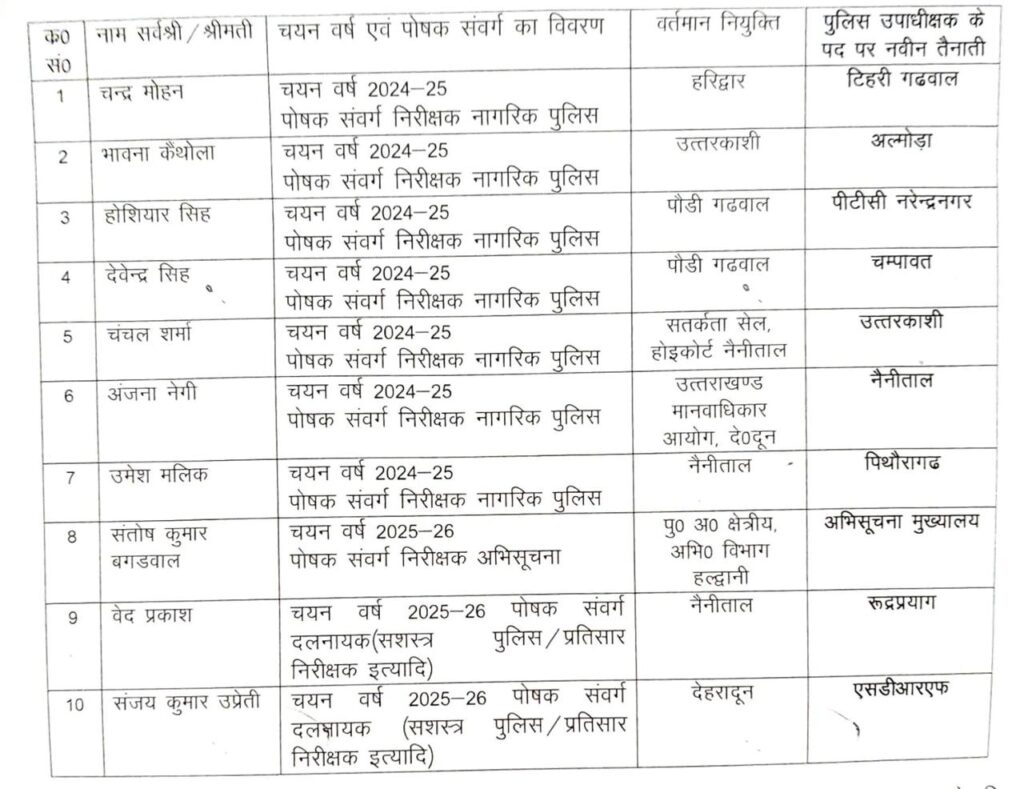 उत्तराखण्ड शासन के आदेश दिनांक 02-03-2026 द्वारा निरीक्षक (नागरिक पुलिस), (अभिसूचना) एवं दलनायक ( सशस्त्र पुलिस/प्रतिसार निरीक्षक इत्यादि) से उत्तराखण्ड पुलिस सेवा संवर्ग के ‘‘ पुलिस उपाधीक्षक, कनिष्ठ वेतनमान’’ के प्रोन्नति कोटा के रिक्त पदों पर पदोन्नति के आधार पर *पुलिस मुख्यालय द्वारा निम्नलिखित निरीक्षक(नागरिक पुलिस), (अभिसूचना) एवं दलनायक (सशस्त्र पुलिस/प्रतिसार निरीक्षक इत्यादि) को ‘‘पुलिस उपाधीक्षक, कनिष्ठ वेतनमान लेवल-10) के पदों पर कार्यभार ग्रहण करने की तिथि से पदोन्नति प्रदान* किये जाने के आदेश पारित किये गये है।